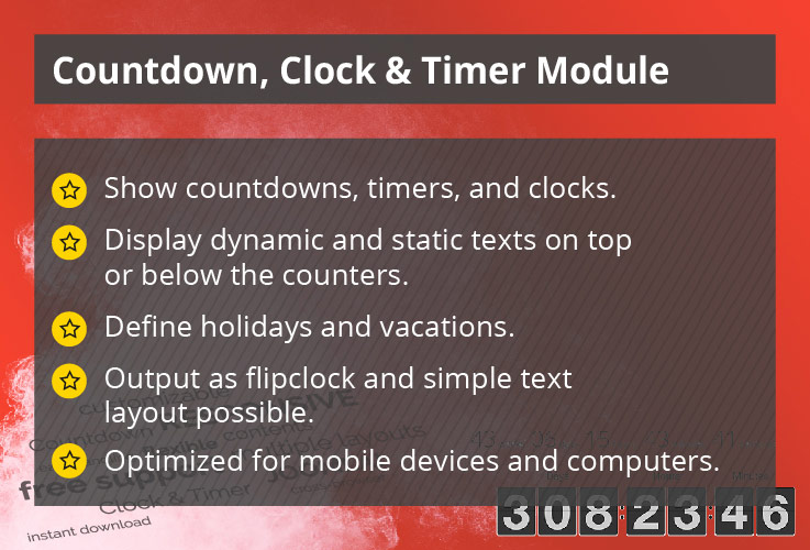 With this Joomla! module, you can display countdowns, timers and clocks anywhere on your website and additionally add dynamic, time-dependent and static texts.