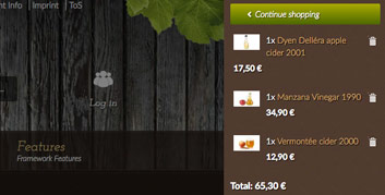 Drop the shopping basket down with the flyout effect. The shopping cart content overlays the underlying content of the website. The effect is very good for use in the header or a sidebar of the website. Example: Flyout